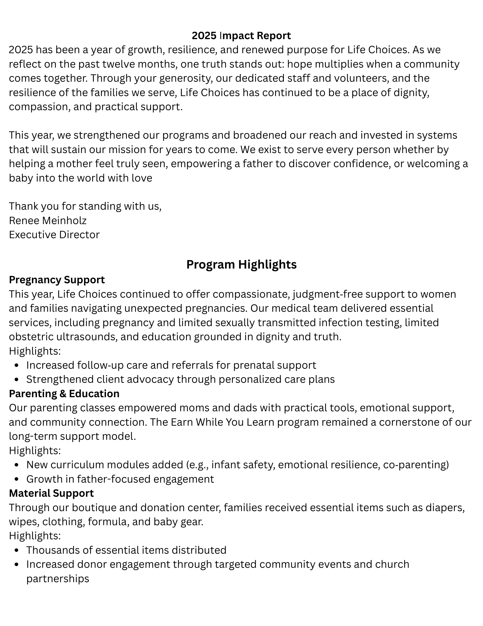 Life Choices is seeing an uptick in clients which is an amazing testimony of God’s faithfulness. We are so thankful to all of our donors for your support.